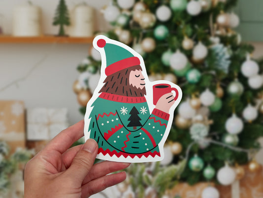 Cozy Sasquatch Drinking Cocoa Christmas Die-Cut Magnet